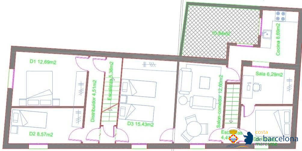 Жилая площадь — 161,60 м², терраса — 26,73 м² (фактические полезные метры по замерам архитектора). Дом состоит из 6 спален, 2 ванных комнат, 2 гостиных и 2 кухонь. Идеально подходит для создания двух независимых жилых зон или одного просторного семейного дома.